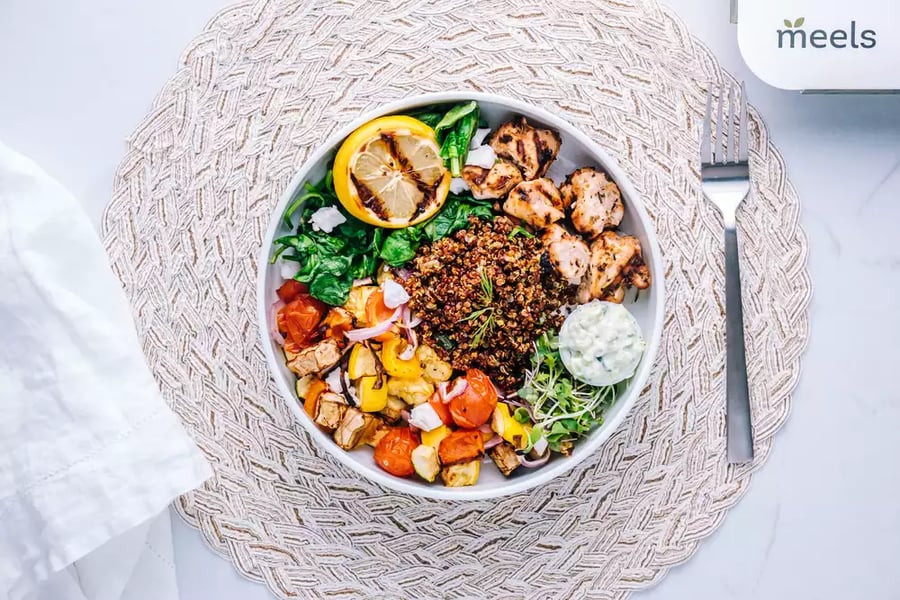 A taste of the Danforth straight from our kitchen! Grilled chicken, roasted Mediterranean veggies on bed of raw baby spina