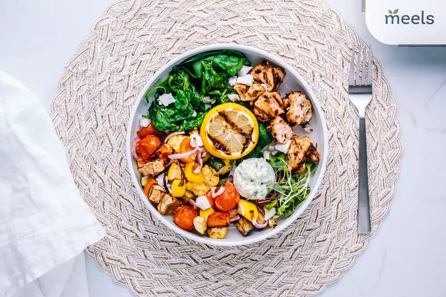 A taste of the Danforth straight from our kitchen! Grilled chicken, roasted Mediterranean veggies on bed of raw baby spina